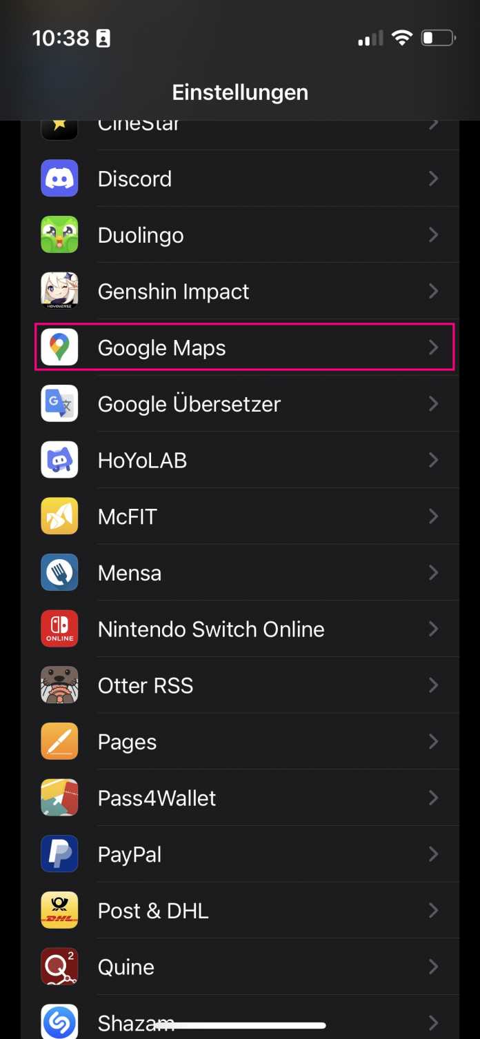 - Ă–ffnen Sie die Einstellungen Ihres iPhones und scrollen Sie nach unten, bis Sie "Google Maps" sehen. Tippen Sie den Punkt an.