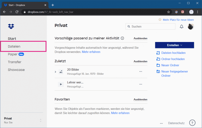 - Melden Sie sich in Ihrer Dropbox an und klicken Sie auf "Dateien".
