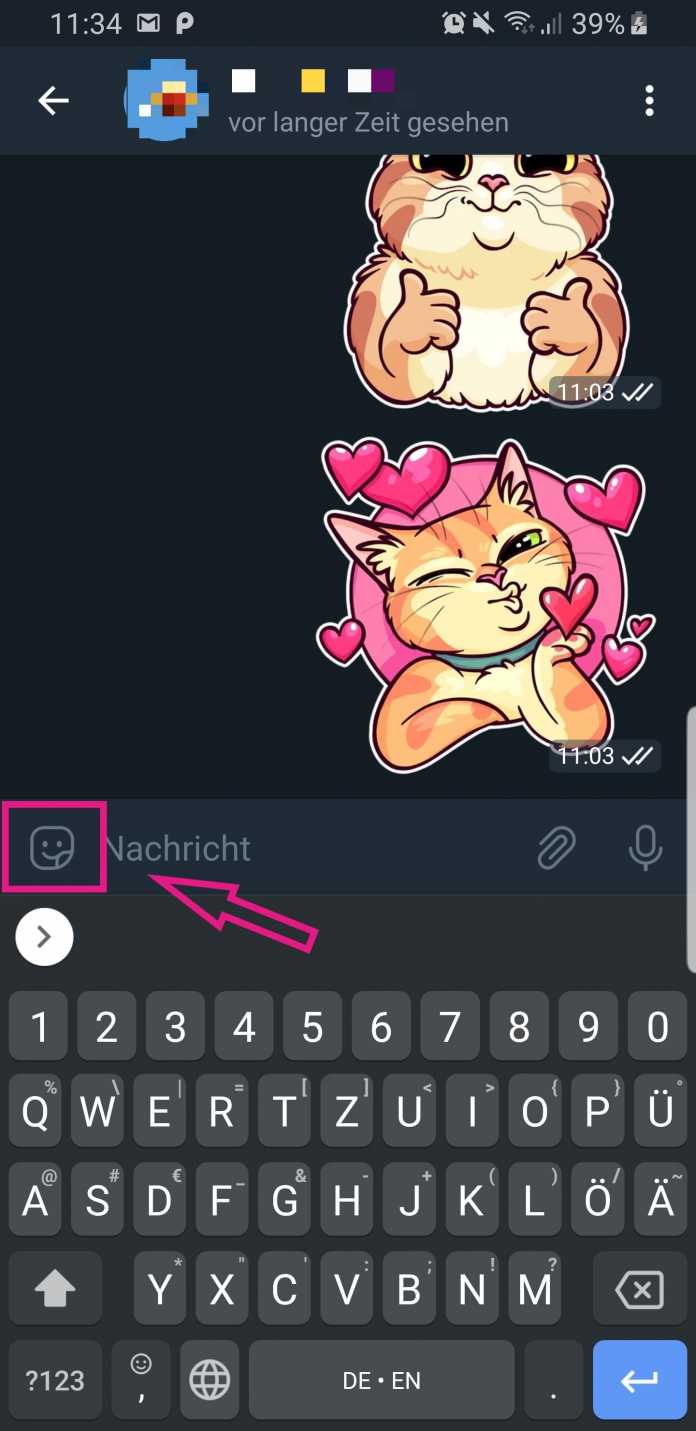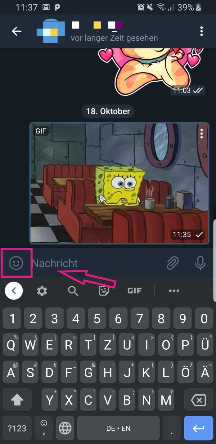 - Ă–ffnen Sie einen Chat und tippen Sie neben dem Textfeld auf das Symbol links. Tippen Sie anschlieĂźend unten auf das Symbol, in dem "GIF" steht.