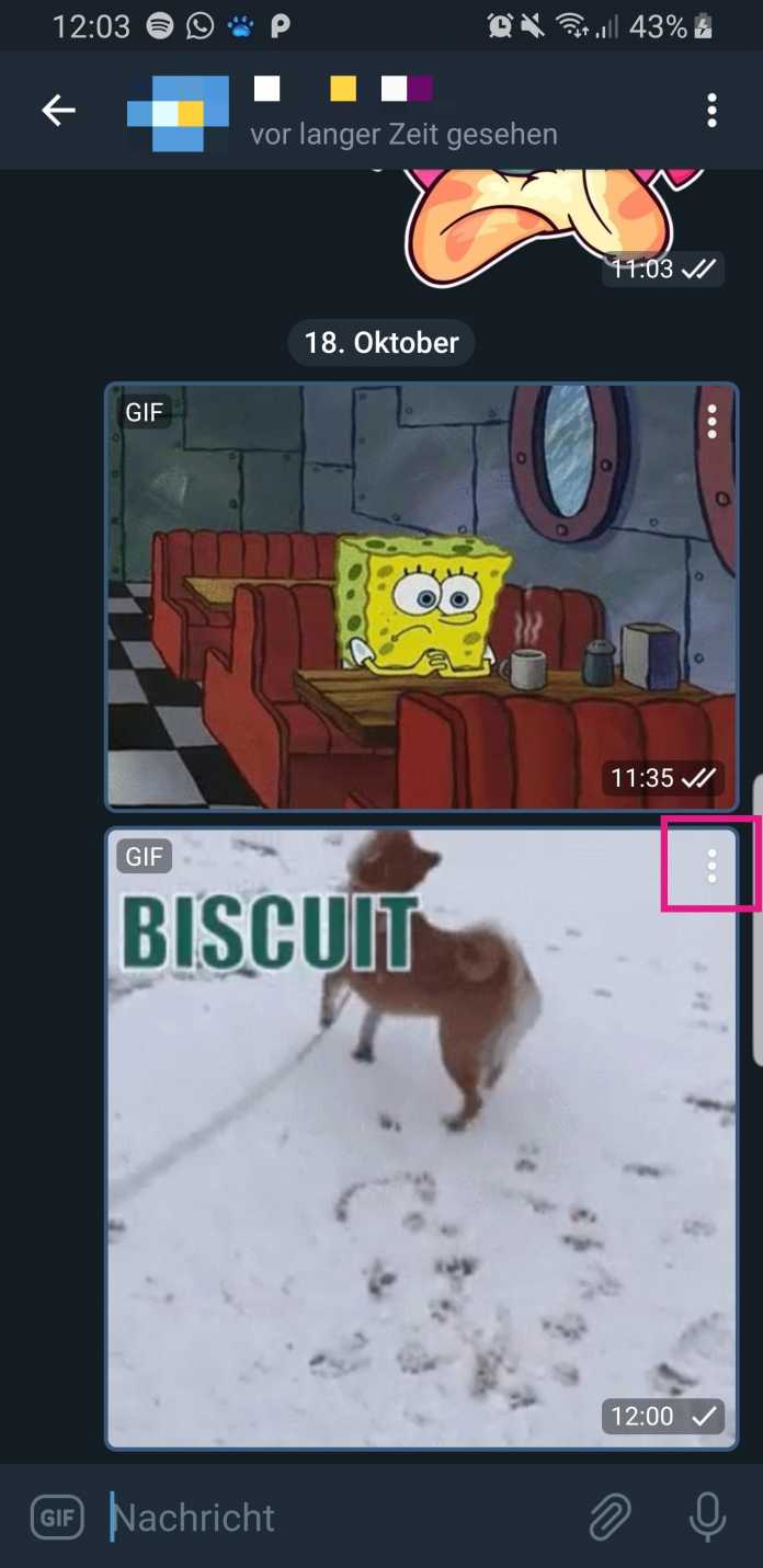 - Ă–ffnen Sie einen Chat in Telegram, in dem Sie das GIF zu einem bestimmten Zeitpunkt versenden wollen. Tippen Sie dort links neben dem Textfeld auf das Symbol und tippen Sie anschlieĂźend unten auf das Symbol, in dem "GIF" steht.