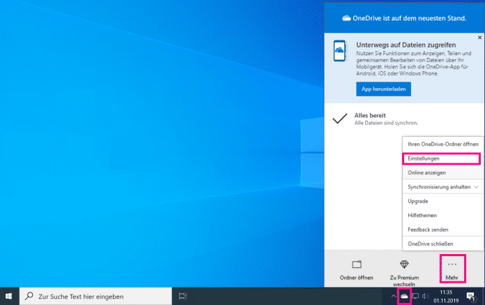 Nach der Anmeldung bei Ihrem Microsoft-Konto erstellt OneDrive automatisch einen lokalen Ordner auf Ihrem PC. Die dort abgelegten Ordner und Dateien werden direkt mit Ihrem Cloud-Speicher synchronisiert. Um den lokalen OneDrive-Ordner zu öffnen, können Sie auf das Wolken-Symbol unten in Ihrer Taskleiste und anschließend auf "Ordner öffnen" klicken.