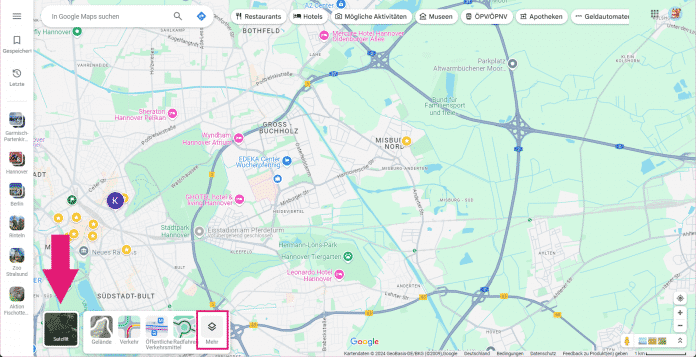 - Klicken Sie unten links auf "Satellit" und anschlieĂźend im MenĂĽ auf "Mehr"