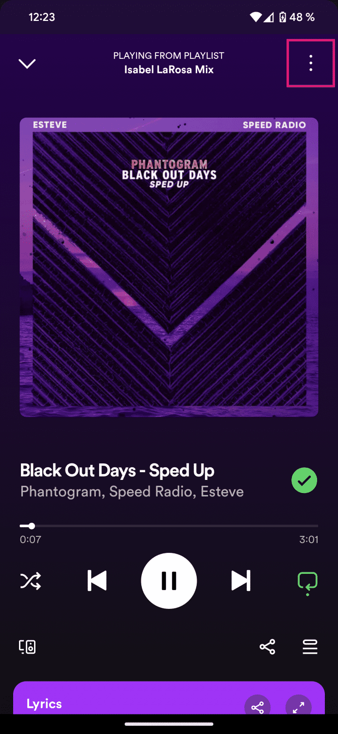 - Ă–ffnen Sie Spotify, starten Sie die Wiedergabe eines Liedes und tippen Sie dann oben rechts auf das Drei-Punkt-MenĂĽ.