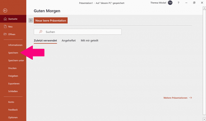 1. Speichern Sie Ihre Präsentation vor der Umwandlung in ein Video als PowerPoint-Datei ab. Dazu klicken Sie auf "Datei" und dann auf "Speichern".