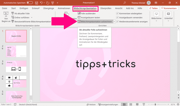 Wechseln Sie in die Registerkarte "Bildschirmpräsentation" und gehen Sie dort auf "Bildschirmpräsentation aufzeichnen".