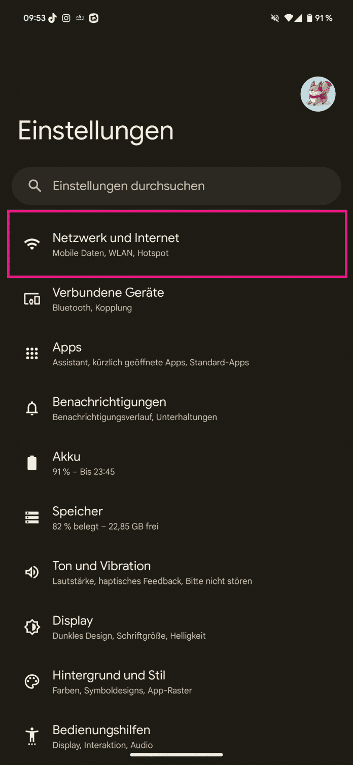 - Öffnen Sie die Android-Einstellungen und tippen Sie auf "Netzwerk und Internet".