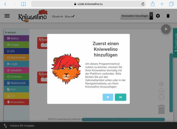 Wer ein Kniwwelino-Programm baut, fängt immer mit zwei roten Blöcken (mache beim Start und wiederhole dauerhaft) an – ähnlich wie die Arduino IDE, die ein void setup und ein void loop vorgibt. Der Übersichtlichkeit halber haben wir das Hauptprogramm, das als endlose Schleife durchläuft, aber sehr kurz gelassen und nutzen mehrere Unterprogramme. Zu finden sind die orangefarbenen Funktionsblöcke mit einem Klick auf den Button >> einfach, sodass alle möglichen Blöcke angezeigt werden.