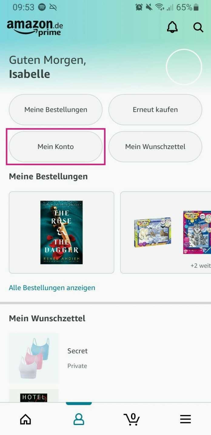 - Bewegen Sie auf Amazon Ihren Mauszeiger oben über "Konto und Listen" und wählen Sie dann "Mein Konto" aus.