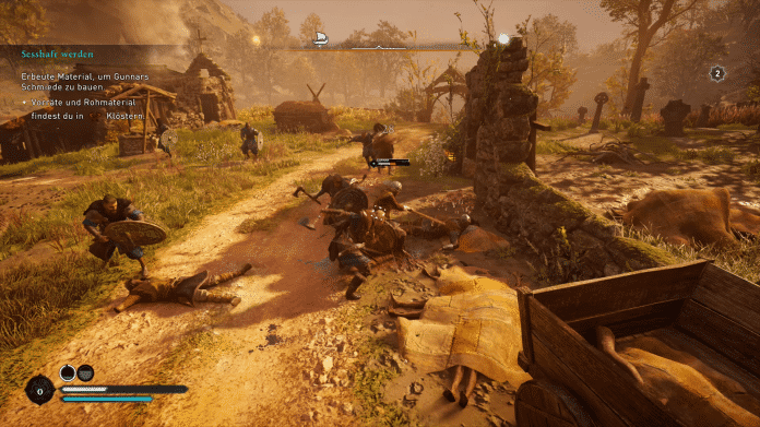 Einige neue spielerische Ideen überraschen. So muss Eivor neben den Kampfmissionen auch ein Dorf aufbauen. Eine Schmiede liefert Upgrades für die Waffen und im Kriegerlager kann man neue Kämpfer für die Raubzüge ausbilden. Mit jedem neuen Gebäude wird das Dorf bekannter und einflussreicher. Eine weitere Neuigkeit: Bündnisse mit anderen Wikingerstämmen bilden. Meist funktionierte das in unseren Anspielstunden durch lange Nebenmissionen, um die Gunst der Stämme zu bekommen. In einem Fall muss Eivor erst eine Anführerin befreien, dann ihre Stadt zurückerobern und ihr danach helfen, einen Verräter aufzudecken.