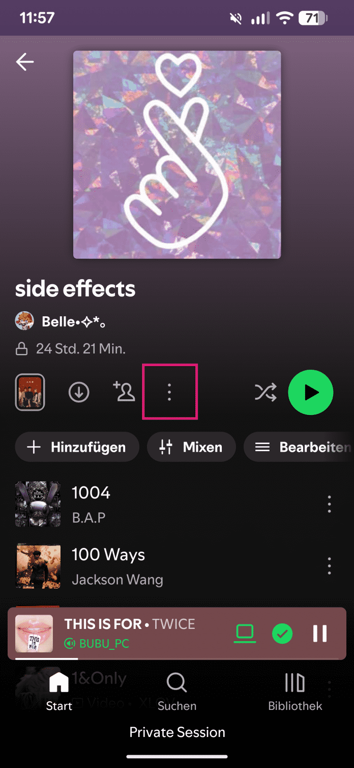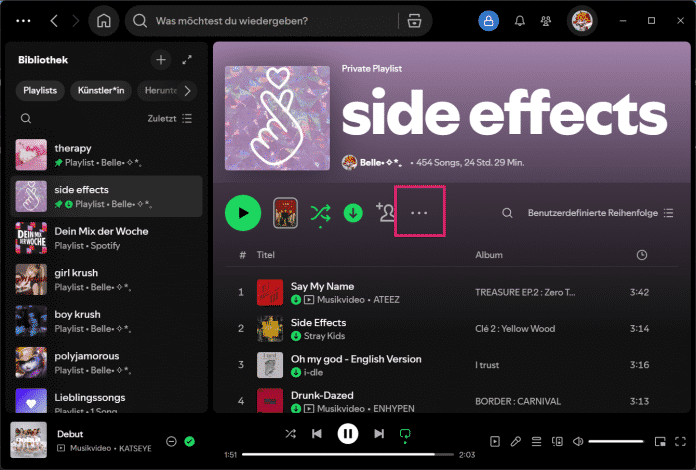 - Ă–ffnen Sie in Spotify die gewĂĽnschte Playlist und tippen Sie auf das Drei-Punkt-MenĂĽ.