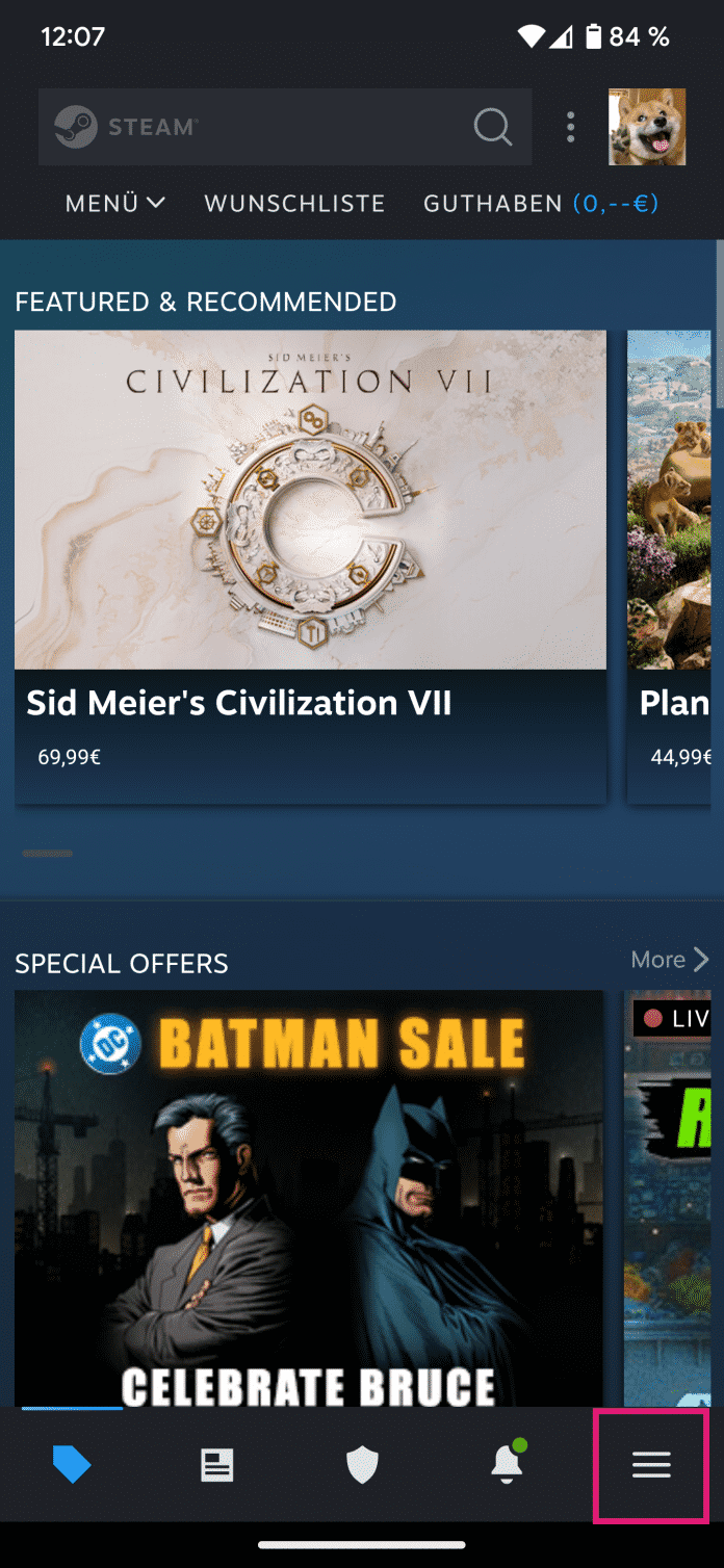 - Ă–ffnen Sie dann das Drei-Strich-MenĂĽ unten rechts und tippen Sie anschlieĂźend auf "Steam Guard".
