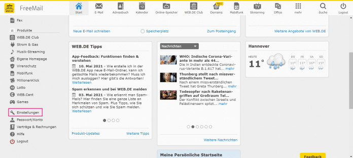 - Loggen Sie sich in Ihr web.de-Konto ein klicken Sie in der Navigationsleiste links auf "Einstellungen".