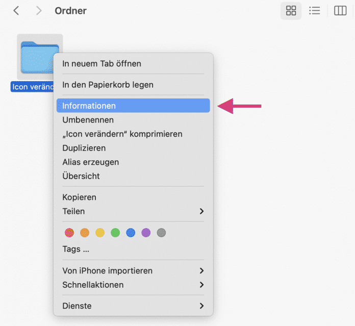- Klicken Sie mit der rechten Maustaste auf den gewünschten Ordner und wählen Sie „Informationen“ aus.