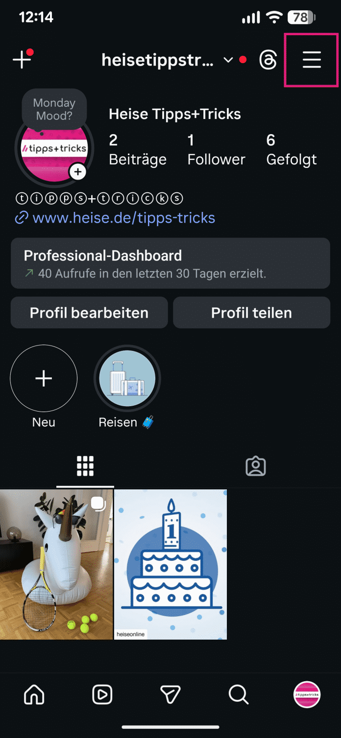 - Ă–ffnen Sie in der Instagram-App Ihr Profil, indem Sie unten rechts auf Ihr Profilbild tippen.