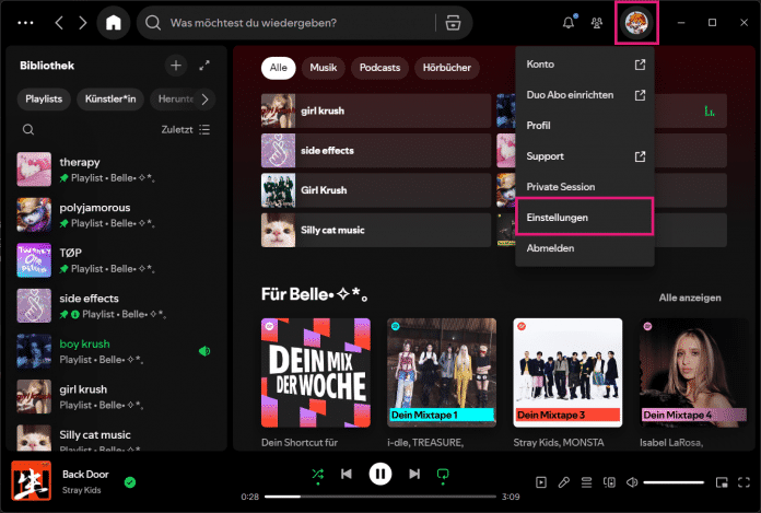 - Öffnen Sie in der Spotify-Desktopanwendung die Einstellungen, indem Sie über Ihr Profilbild oben rechts das Menü öffnen und den passenden Eintrag auswählen.