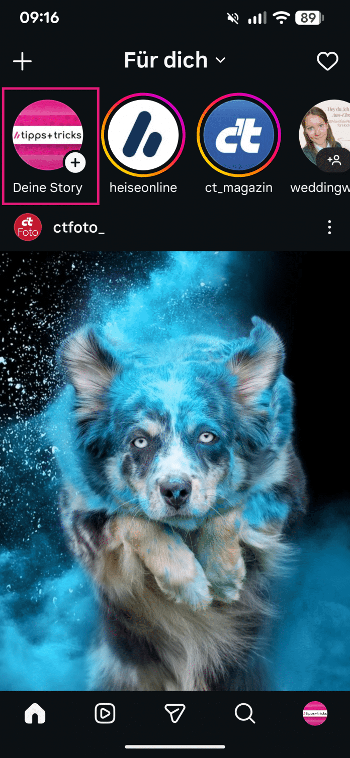 - Wechseln Sie vom Instagram-Startbildschirm zur Kameraansicht durch einen Wisch nach rechts oder dem Antippen der Story-Funktion.