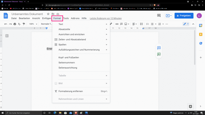 - Markieren Sie den durchzustreichenden Text und klicken Sie oben in der MenĂĽleiste auf "Format"