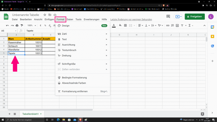- Tippen Sie die Zelle mit dem Text an, der durchgestrichen werden soll. Wählen Sie danach oben in der Menüleiste den Punkt "Format" aus.