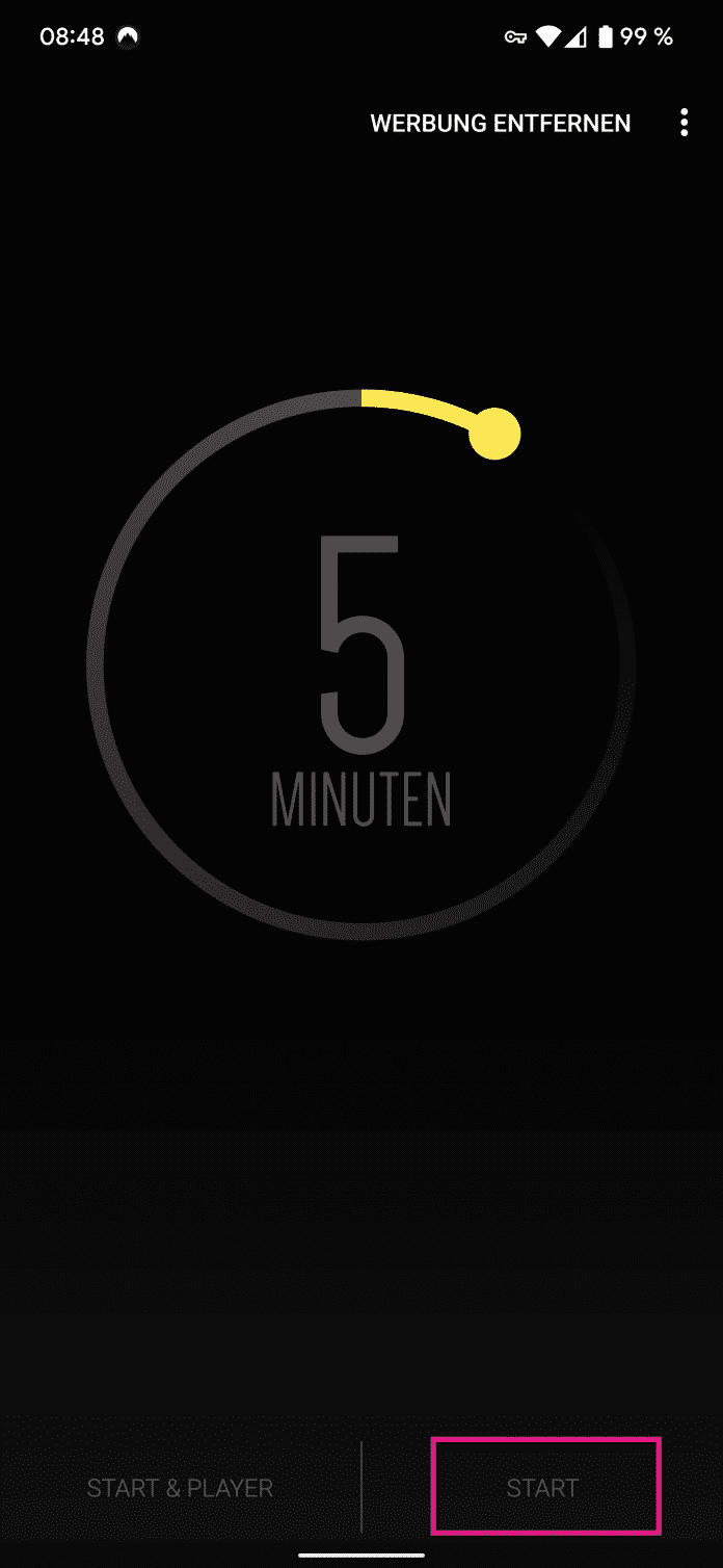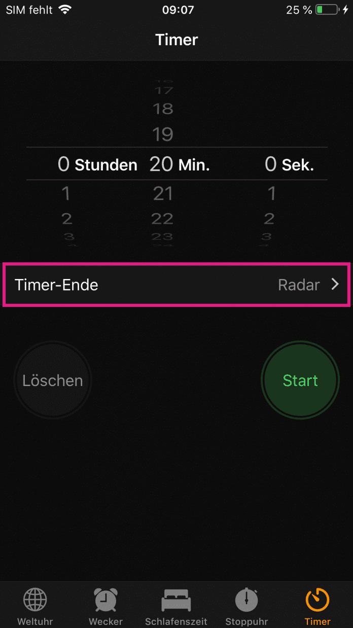 - Stellen Sie nun eine gewĂĽnschte Zeit fĂĽr Ihren Timer ein und tippen Sie danach unten rechts auf "Start".