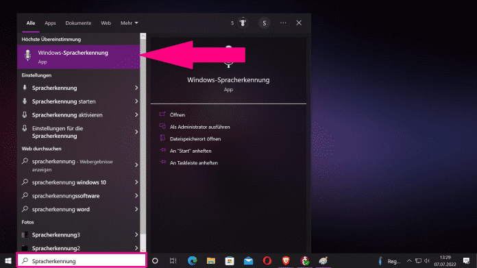 - Geben Sie den Befehl "Spracherkennung" im Suchfeld Ihrer Taskleiste ein und wählen Sie danach den ersten Vorschlag "Windows-Spracherkennung" aus.