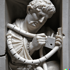 Die berühmte Laokoon-Gruppe stellt den armen Whistleblower mit seinen Söhnen im Würgegriff der Schlangen dar. Wie sähe es aus, wenn ein griechischer Bildhauer die Marmorstatue eines IT-Fachmanns nach dem Vorbild der Laokoon-Gruppe erstellt hätte? Das KI-System DALL·E 2 zeigt mögliche Antworten.
