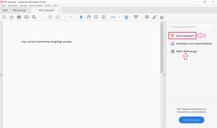1. Ă–ffnen Sie das PDF-Dokument im Adobe Reader. Klicken Sie auf "Kommentieren".