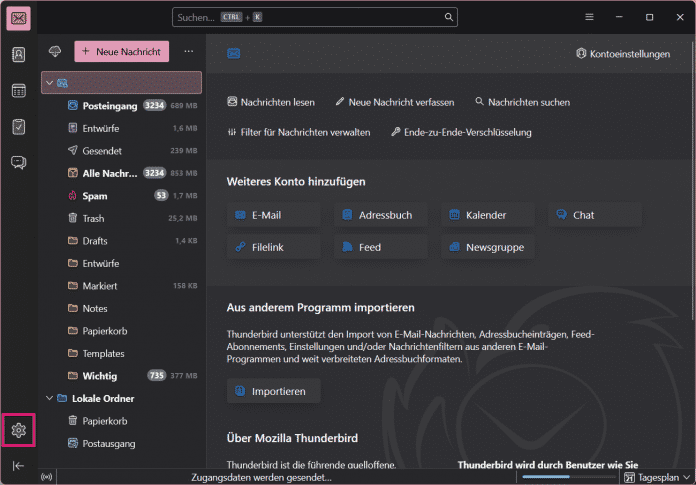 - Ă–ffnen Sie die Einstellungen in Thunderbird, indem Sie auf das Zahnrad-Symbol unten links klicken.