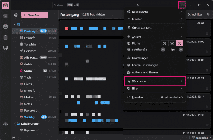 - Starten Sie Thunderbird und klicken Sie oben rechts auf das Burger-MenĂĽ.