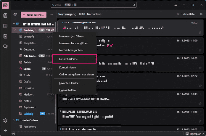 - Erstellen Sie in Thunderbird einen neuen Ordner, in den Sie dann später E-Mails nach einer Regel verschieben können. Machen Sie dafür einen Rechtsklick auf die E-Mail des gewünschten Kontos links und wählen Sie dann "Neuer Ordner" aus. Geben Sie dem Ordner einen Namen und klicken Sie auf "Ordner erstellen".