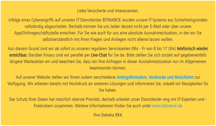 Krankenkassen wie die DAK waren durchgehend erreichbar und konnten lediglich für ein paar Tage keine Krankschreibungen verarbeiten. Mit den Maßnahmen habe Bitmarck jedoch größeren Schaden abwenden können. Während einige Krankenkassen kaum von den Maßnahmen betroffen sind, seien Bitmarck zufolge vor allem Krankenkassen im südlichen Raum von Einschränkungen im Tagesgeschäft betroffen.