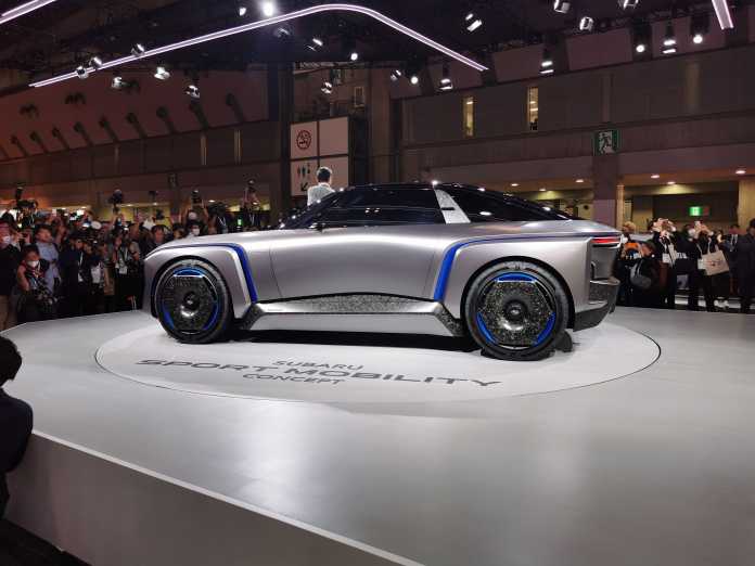 So etwa bei Subarus Sport Mobility Concept, ein bulliges BEV im kantigen Design mit Recycling-Radkappen. Immerhin hatte Subaru noch ein Flugtaxi dabei. Das Air Mobility Concept besteht aus einer kleinen Kabine, die von sechs Turbinen in die Luft gehoben wird.