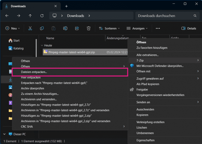 - Laden Sie sich über folgenden Link FFmpeg herunter: https://www.heise.de/download/product/ffmpeg-53902. Nach dem Download extrahieren Sie die Dateien, indem Sie einen Rechtsklick darauf machen und dann die Option aus dem Menü wählen.