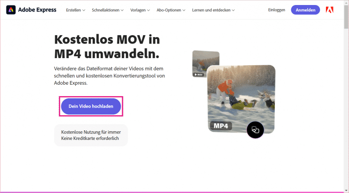 - Rufen Sie folgende Webseite auf: https://express.adobe.com/tools/convert-to-mp4. Hier klicken Sie auf die Schaltfläche "Dein Video hochladen".