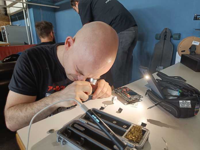 In einem Workshop wurde der Badge um einen kleinen Synthesizer erweitert und mit Fotodioden, Signale von IR-Fernbedienungen oder der Lightshow des DJ nachgespürt. Etliche Besucher hatten auch schon ein 3D-Gedrucktes Gehäuse dabei oder andere Hardware um das Badge zu hacken und so wurde dann auch fleißig gelötet.