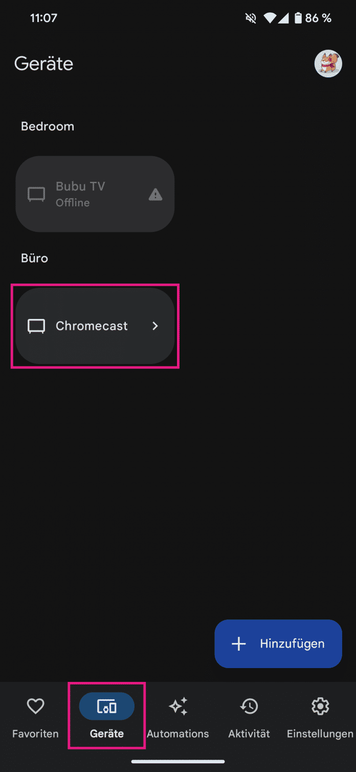 - In der Google-Home-App tippen Sie unten auf "Geräte" und wählen dann Ihren Chromecast aus.