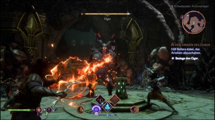 Kämpfe gegen riesige Drachen oder Dämonen lassen das Stresslevel in die Höhe schnellen. Im Vergleich zu früheren Titeln der Reihe ist alles ein wenig temporeicher und spektakulärer geworden. Besonders wenn Magier oder Schurke mit Feuerzaubern oder Bogenschüssen ihre Gegner attackieren, ähnelt das eher einem Third-Person-Shooter als einem taktischen Rollenspiel. Zwar können die Spieler jederzeit das Spiel anhalten und ihren beiden Mitstreitern Befehle geben, aber in der Praxis war das auf dem mittleren Schwierigkeitsgrad unnötig. Die unverwundbaren Helfer machten ihren Job auch allein ganz ordentlich.