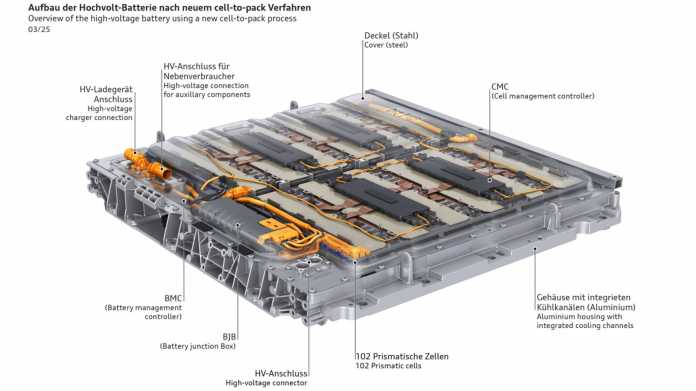 The battery measures just under one square meter and is almost 18 cm high. It is arranged using the cell-to-pack method. The cells are no longer placed in a module, but glued directly into the battery housing. This makes subsequent replacement more difficult, but allows the manufacturer to achieve a higher packing density. Ultimately, this means lower costs and a reduced space requirement in the car.