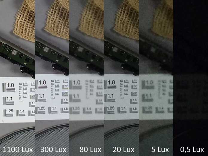 In diesen Idealbedingungen ergab sich ein Visual-Noise-Wert von 1,5, der sogar unter dem Niveau von Top-Smartphones wie iPhone 6 Plus und Galaxy S6 liegt. Der Wert beschreibt die Neigung zum störenden Bild- und Farbrauschen in Bildern. Natürlich tritt in den Bildern dennoch Rauschen auf, solange das Motiv einigermaßen gut beleuchtet ist, fällt es aber nicht wesentlich auf. Ab einer Beleuchtung von unter 80 Lux – also ungefähr spätabendliche Beleuchtung – tritt deutlich wahrnehmbares Bildrauschen, aber nie Farbrauschen auf. Einige teurere Telefone wie das LG G4 gehen ebenfalls bei dieser Helligkeit in die Knie. Geräte um die 200 Euro anderer Hersteller haben schon früher Probleme.