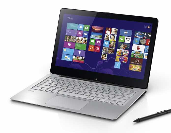 Sony zeigt ein besonders flaches Windows-Tablet mit eingebautem, verstellbarem Ständer und ein Notebook mit Deckelscharnier, das ein Drehen des Displays nach außen erlaubt. Es ist zudem in einer 15-Zoll-Version mit 212 dpi auflösendem Display erhältlich.