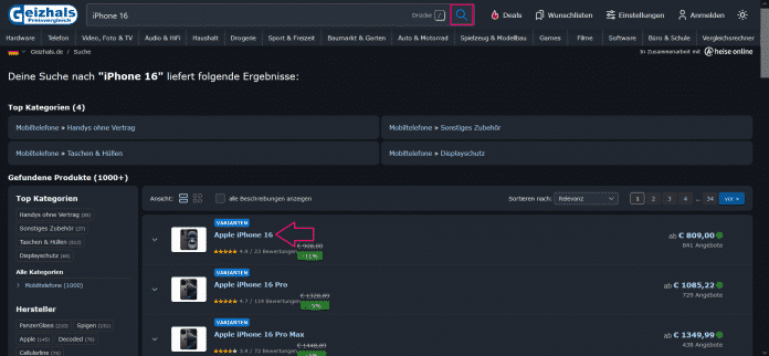 - Geben Sie in der Suchleiste das Produkt ein, dessen Preise Sie vergleichen wollen und klicken Sie auf das Lupen-Symbol.