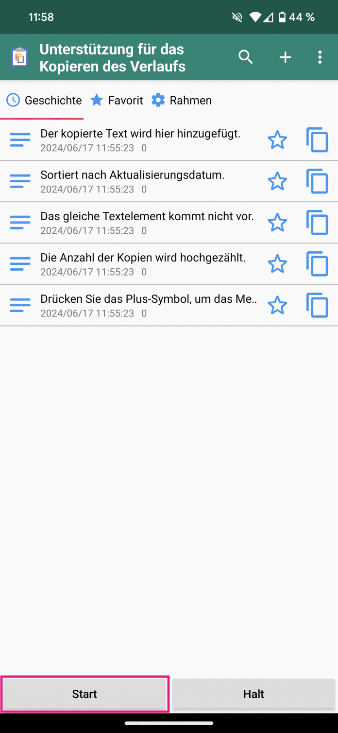 - Nachdem Sie nach dem ersten Öffnen der Clipboard-Manager-App die benötigten Berechtigungen erteilt haben, tippen Sie unten links auf "Starten".