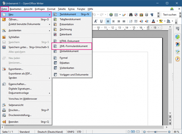 - Klicken Sie in OpenOffice oben links auf "Datei" und wählen Sie dann aus dem Menü "Neu" und anschließend "XML-Formulardokument" an.