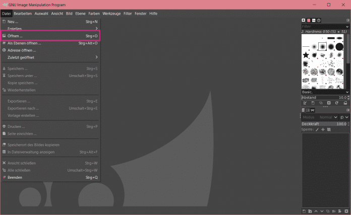 - Öffnen Sie in GIMP Ihr Bild, indem Sie oben links auf die Registerkarte "Datei" klicken und dann "Öffnen..." wählen. Suchen Sie dann Ihr Bild aus und klicken Sie auf die Schaltfläche "Öffnen".
