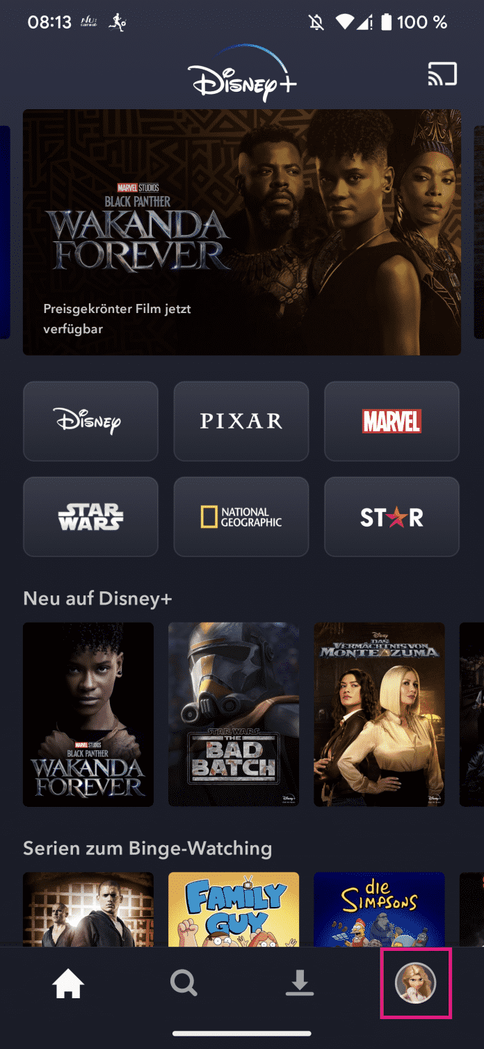 - Öffnen Sie die Disney-App auf Ihrem Smartphone. Wählen Sie dort Ihr Profil aus und tippen Sie dann auf Ihr Profilbild unten rechts.
