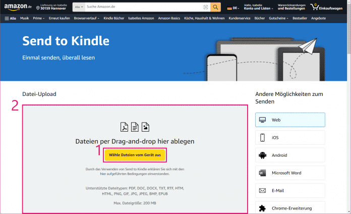 - EPUB-Dateien auf Amazon-Webseite an Kindle senden