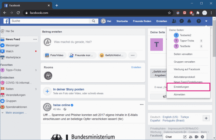 - Ă–ffnen Sie Facebook und melden Sie sich mit Ihren Zugangsdaten an. Klicken Sie dann oben rechts auf den nach unten zeigenden Pfeil und klicken Sie auf "Einstellungen".