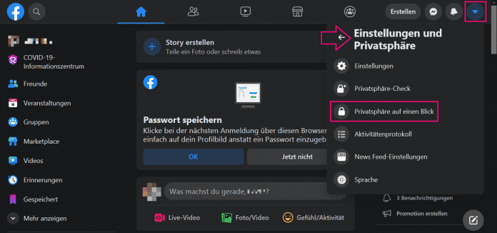 - Melden Sie sich bei Facebook an und klicken Sie auf den Pfeil oben rechts. Im Menü wählen Sie erst "Einstellungen und Privatsphäre" und dann "Privatsphäre auf einen Blick".