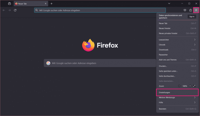 - Gehen Sie in Firefox auf das Burger-Menü oben rechts und öffnen Sie die "Einstellungen".