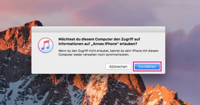 - Schließen Sie Ihr iPhone an den Mac an und bestätigen Sie mit "Fortfahren", dass Sie dem Computer den Zugriff auf das iPhone erlauben.