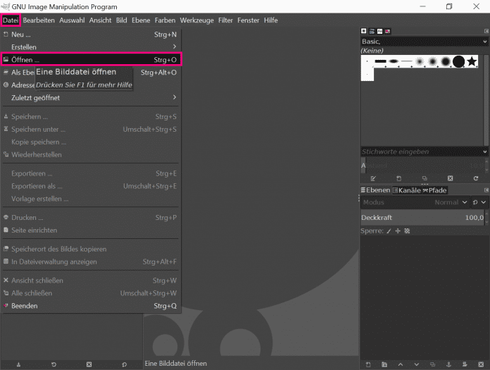 - Öffnen Sie über "Datei" und "Öffnen" oder mit [Strg] + [O] ein Foto in GIMP.